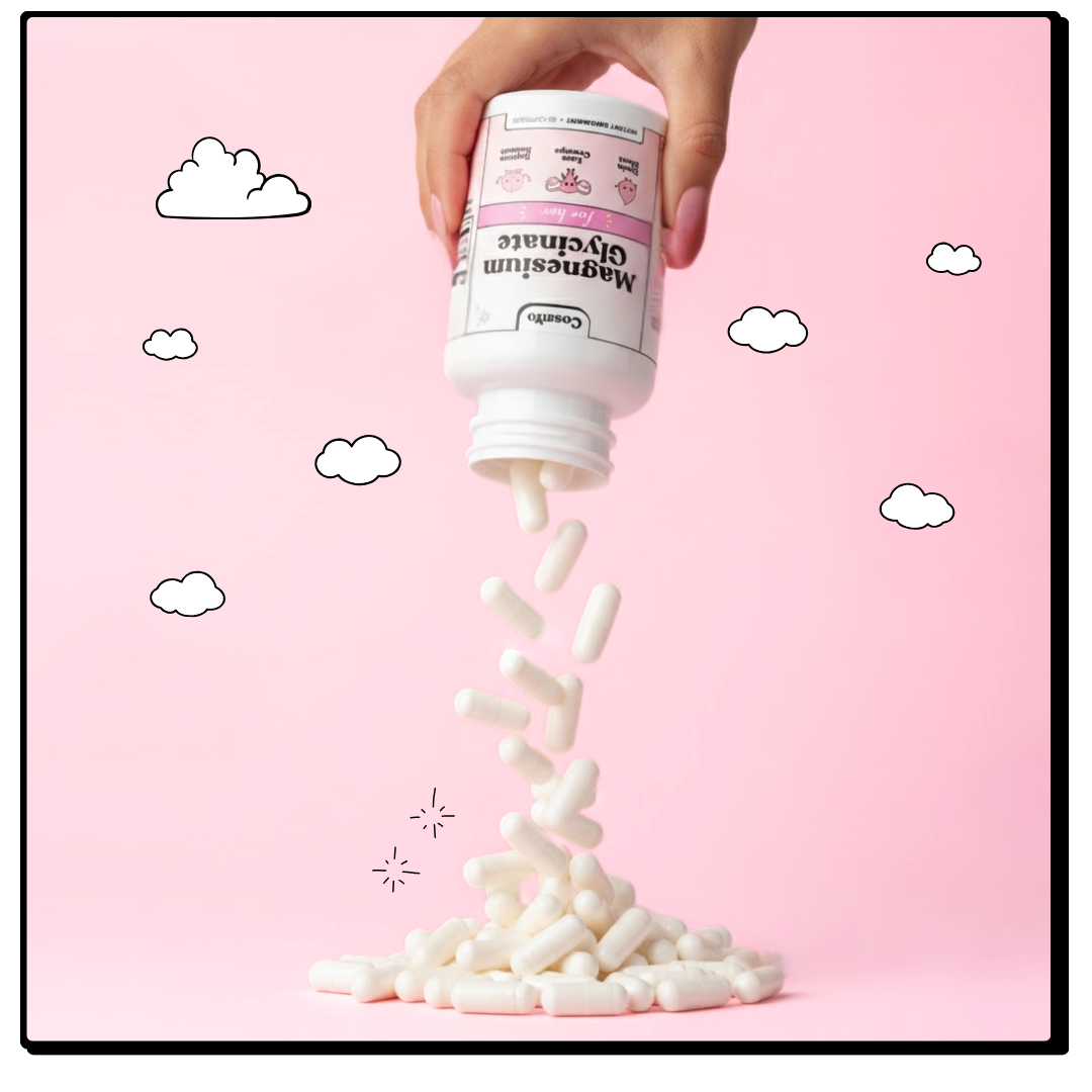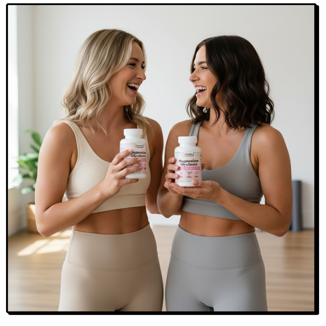Magnesium Glycinate specifically flushes excess estrogen, drains water retention, and calms the cortisol that makes PMS bloating worse
